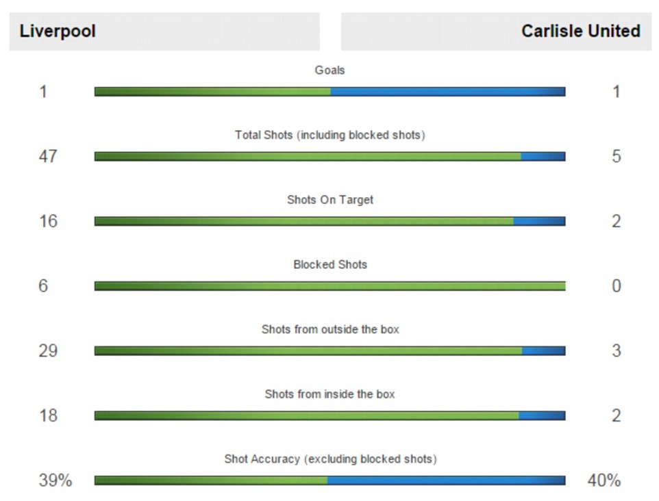 Thông số trận đấu giữa Liverpool và Carlisle United ở vòng 3 League Cup.