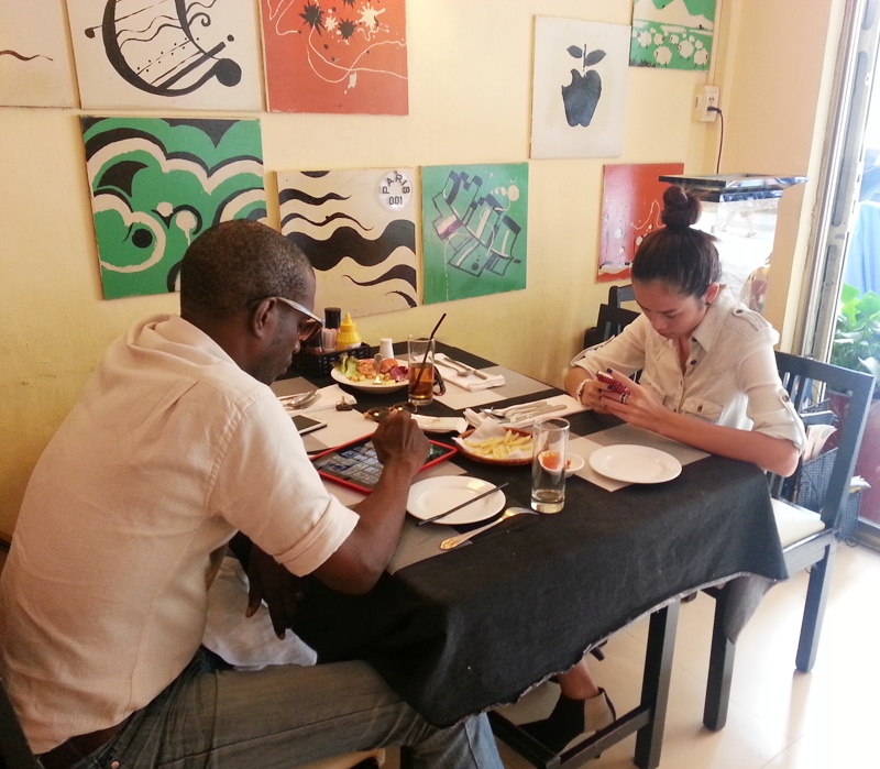 Trong khi chờ món ăn, mỗi người cắm cúi làm một việc. Hiện tại, Thu Hiền đang là cái tên được nhiều người chú ý bởi nỗ lực không ngừng trong cuộc thi Amazing Race.