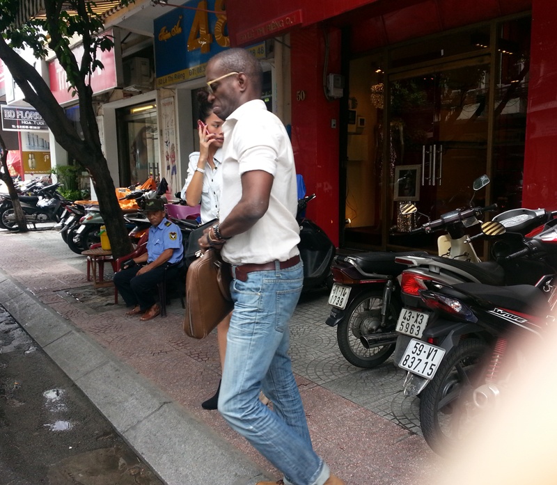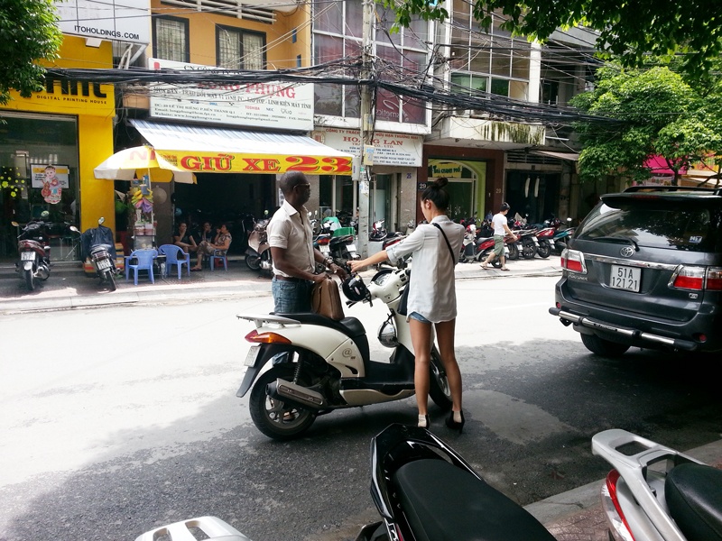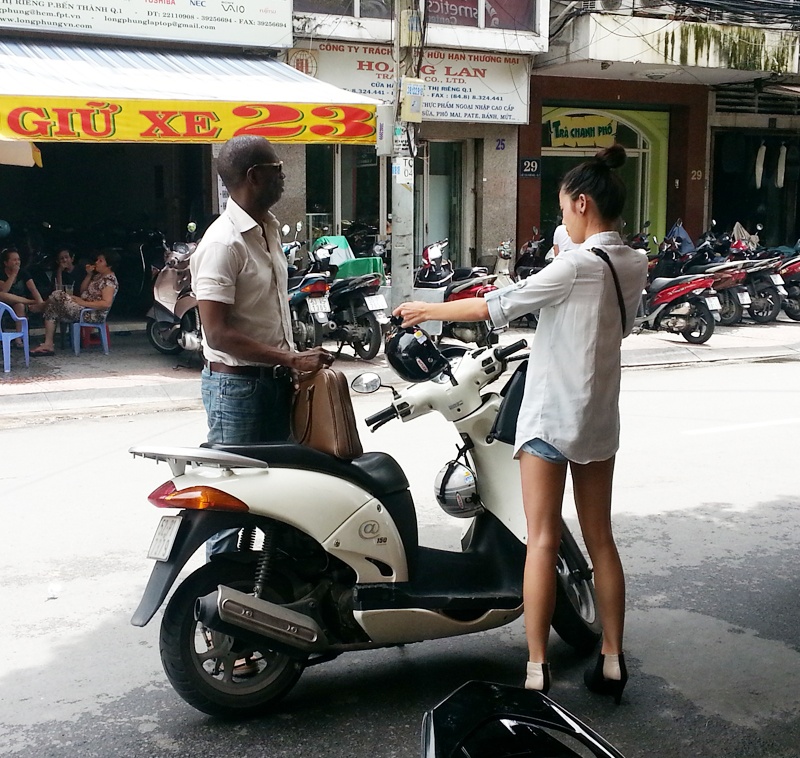 Không giống nhiều cặp đôi nổi tiếng khác, Henri Hubert và Thu Hiền chọn cách di chuyển bằng xe máy. Chiếc xe vốn khá hoành tráng so với vóc dáng người Việt bỗng dưng trên nên bé tí hon khi ở bên Henri và Thu Hiền.