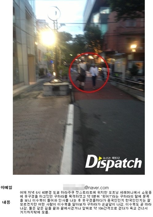Mới đây, trang tin Dispatch tiếp tục làm dấy lên mối nghi ngờ của fan khi tung ra loạt ảnh Hara và Soo Hyuk đi chơi cùng nhau. Khoảng 9h tối ngày 11/8, cặp đôi này và anh bạn chung Hong Jong Hyun bị bắt gặp xuất hiện ở một nhà hàng Trung Quốc. Để tránh sự để ý, 3 người lần lượt đi ra sau một quãng thời gian ăn uống vui vẻ chứ không đi cùng nhau. Hara và Lee Soo Hyuk đều đội mũ và cúi xuống che mặt.