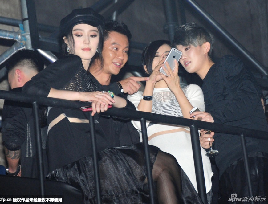 | Phạm Băng Băng gần như ngã hẳn vào lòng Lý Thần khi chụp ảnh chung cùng bạn bè. |