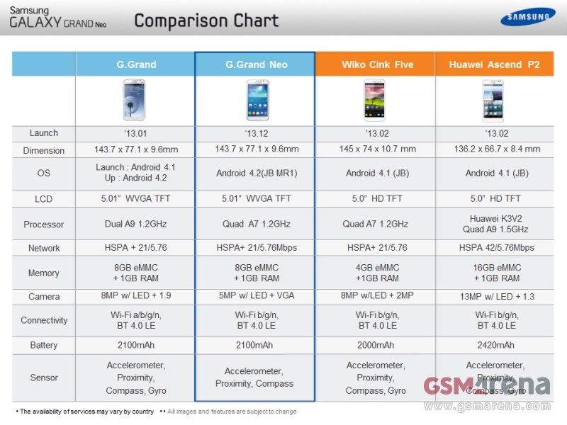 | Bảng so sánh cấu hình của Galaxy Grand Neo so với Grand thế hệ đầu và một vài thiết bị khác. Ảnh: GSMArena |