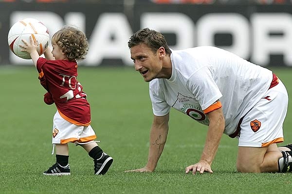 | Totti chơi bóng cùng con trai. Ảnh: Gazzetta dello Sport. |