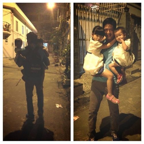 | Hình ảnh ông bố tay bông, tay bế hai cô con gái yêu đi trong đêm khiến nhiều người cảm động. |