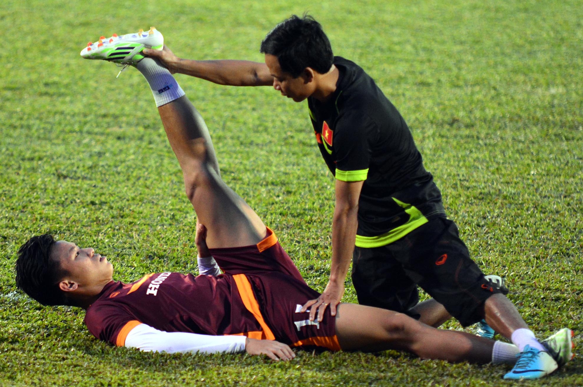 | Trung Vệ Quế Ngọc Hải cũng gia nhập danh sách các cầu thủ chấn thương, anh và Hồng Duy được các bác sĩ hướng dẫn tập nhẹ bên ngoài sân. |