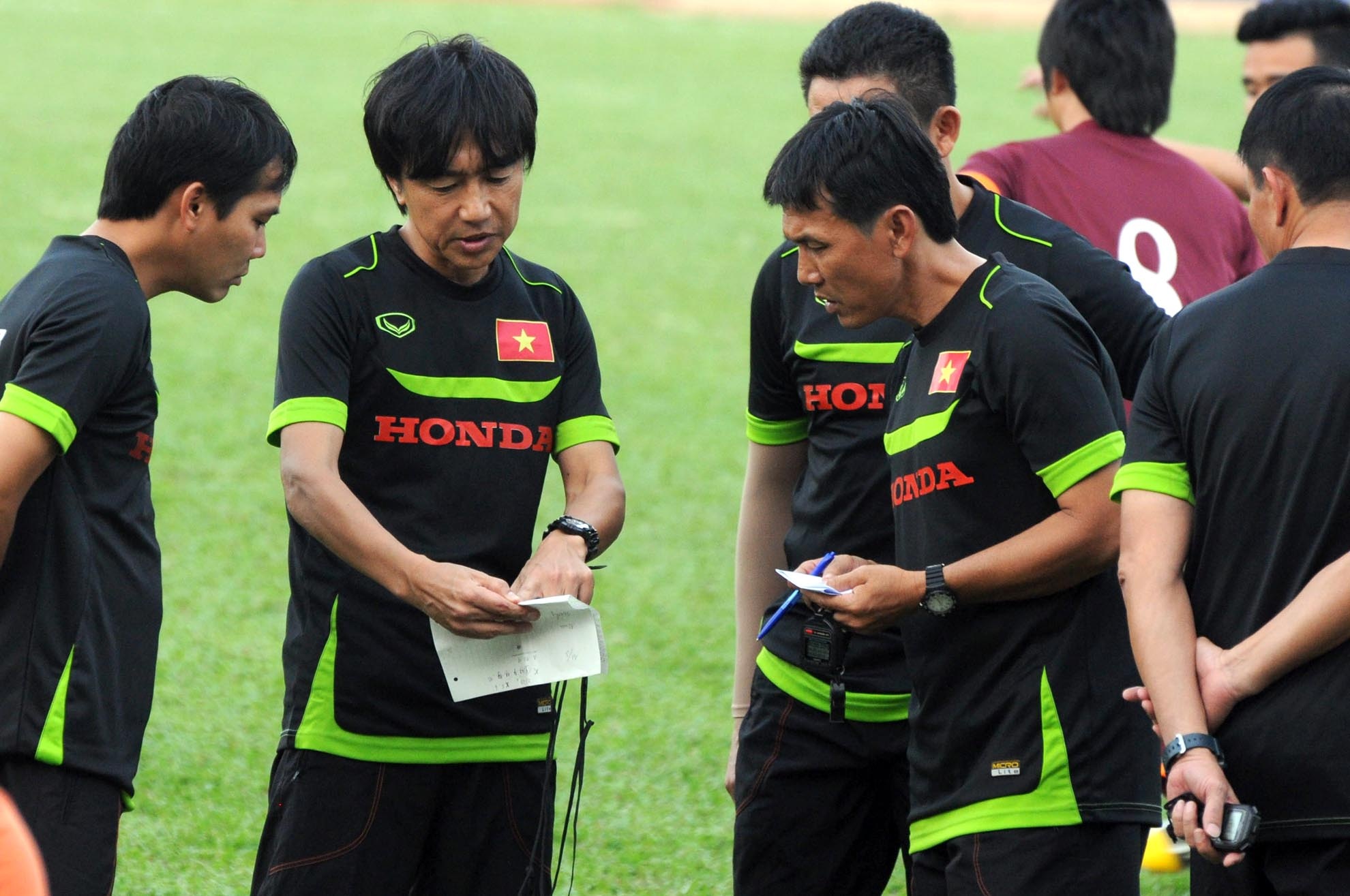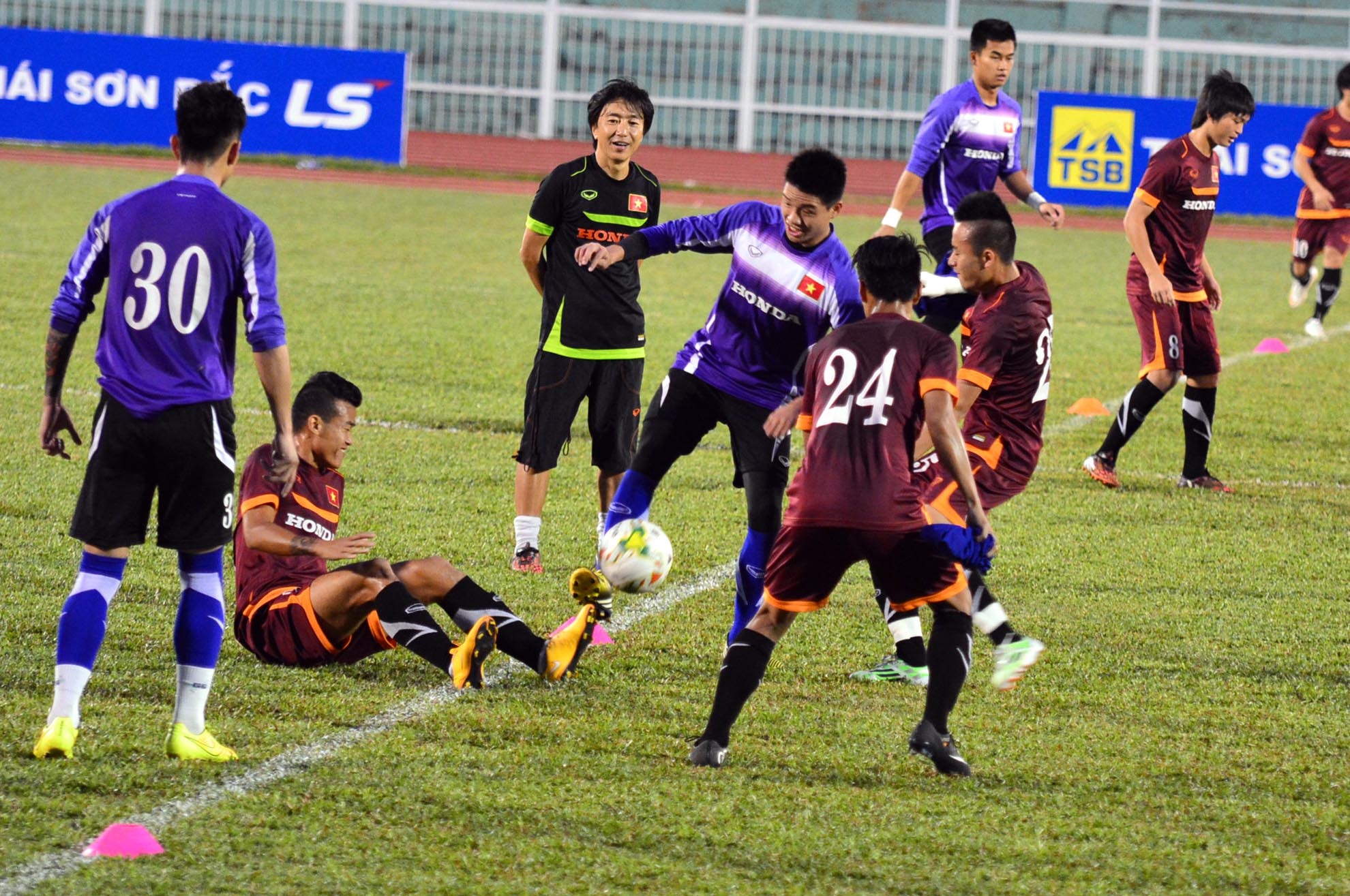 | Không khí buổi tập khá thoải mái và vui vẻ, HLV Miura chỉ đứng quan sát các học trò chơi đá ma trên sân. |