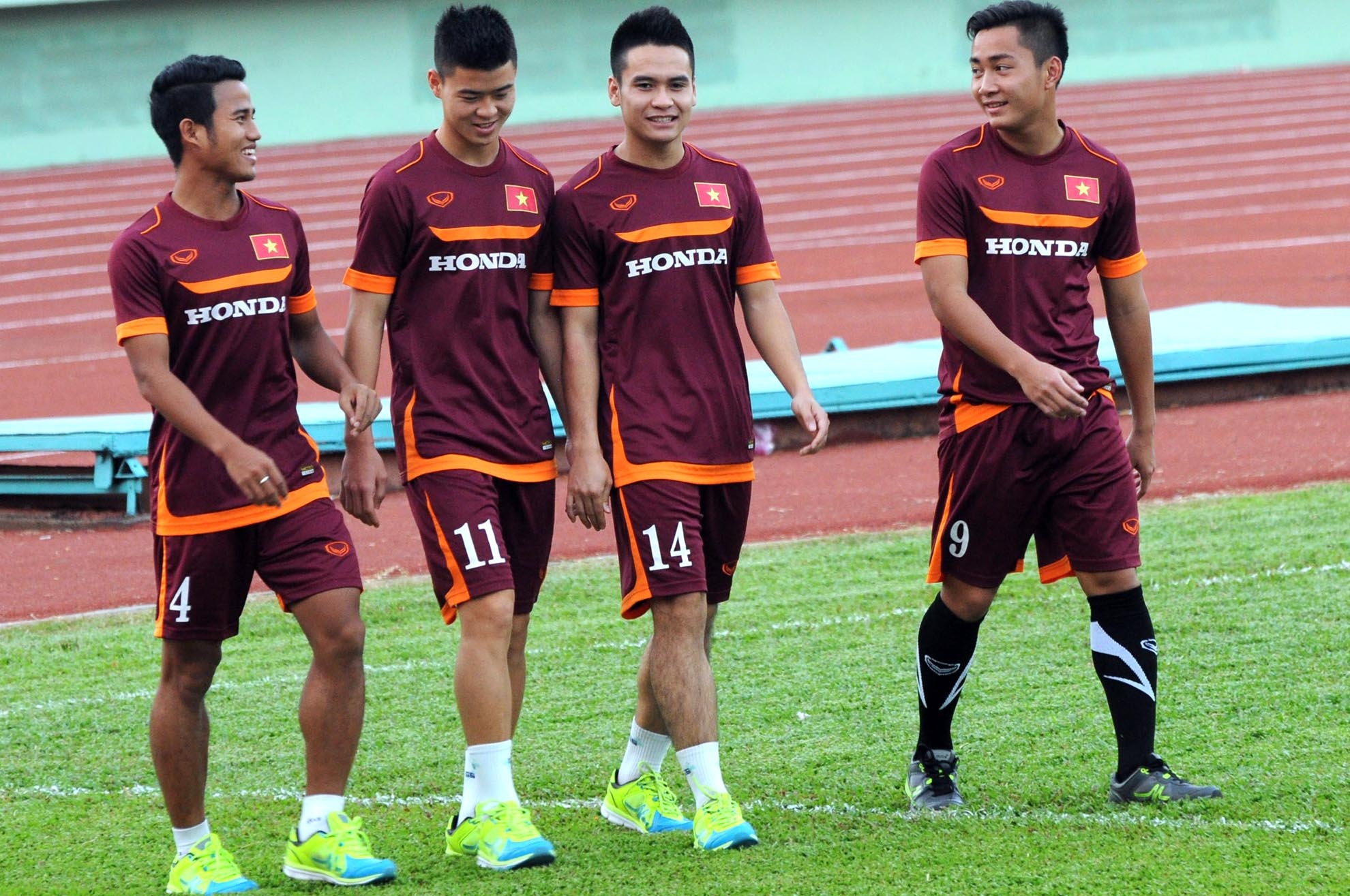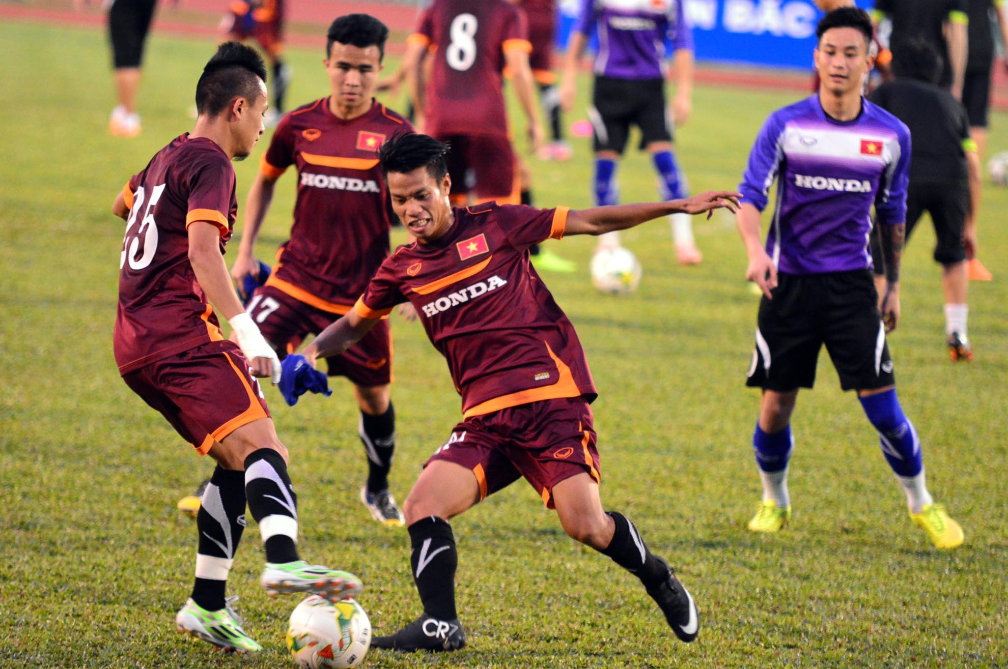 | Công Phượng cùng đồng đội chỉ tập các bài khởi động và tiếp xúc bóng để lấy cảm giác. Trong đợt tập trung tại TP HCM, cơn bão chấn thương đổ bộ khiến nhiều cầu thủ phải ngồi ngoài. |