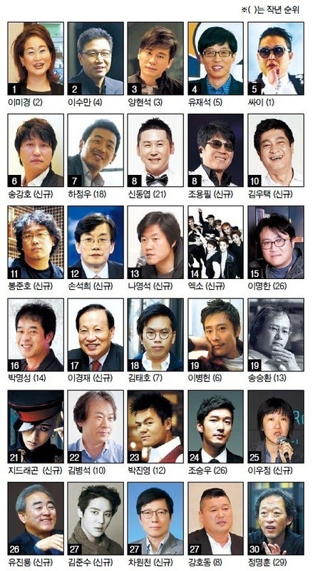 Vừa qua, Herald Economics, một trong những bảng xếp hạng uy tín nhất tại Hàn đã khép lại năm 2013 với kết quả khảo sát từ các chuyên gia hoạt động trong ngành giải trí và các nhà báo để chọn ra Top 30 người có sức ảnh hưởng tới làng giải trí Hàn Quốc. Bảng xếp hạng sẽ chọn lọc các nhân vật dựa trên phạm vi hoạt động và sự ảnh hưởng của họ đối với làng giải trí nói chung.