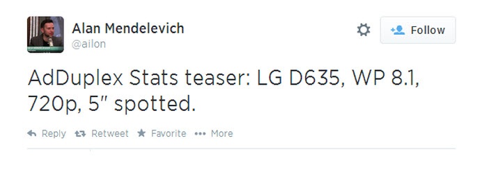 Theo Alan Mendelevich, người sáng lập công ty chuyên nghiên cứu thị trường AdDuplex, vừa tiết lộ trên tài khoản Twitter của mình rằng thiết bị chạy Windows Phone 8.1 sắp tới của LG có tên mã là D635.