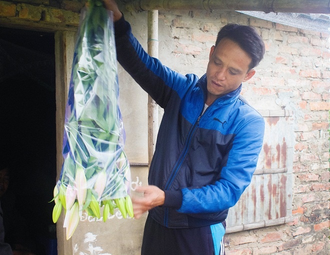 Chị Thủy, một thương lái ở Kim Động, Hưng Yên đến mua hoa cho hay: “Tôi bán một bó hoa ly 3 tai và 5 tai xếp xen kẽ nhau chỉ có 60.000-70.000 đồng/chục cành. Lãi không được bao nhiêu, đấy là chưa kể về còn phải ủ hoa”.