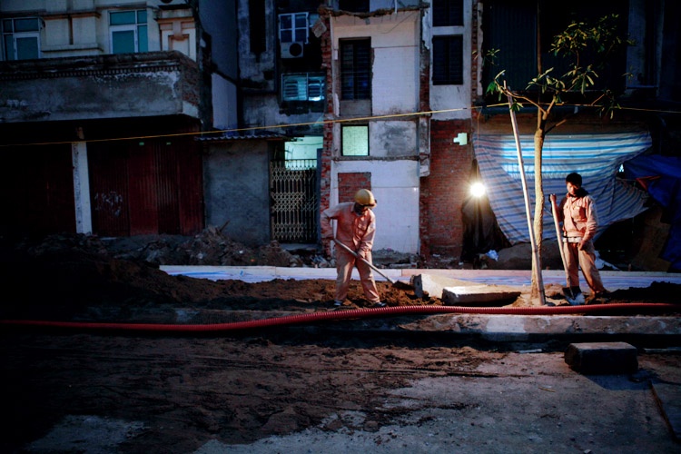 | Khi màn đêm buông xuống, các phương tiện thi công vẫn sáng đèn. |