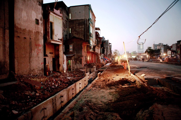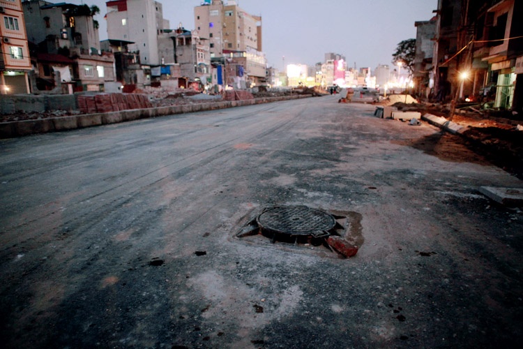 | Mặt trước ngôi nhà là đường đê La Thành, mặt sau là đường vành đai 1. Các hộ dân 2 bên đã được di dời sau giải phóng mặt bằng. |