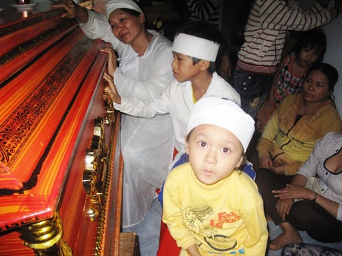 Bà Huỳnh Thị Thao cùng 2 con gào khóc trước quan tài của ông Trương Quốc Công.