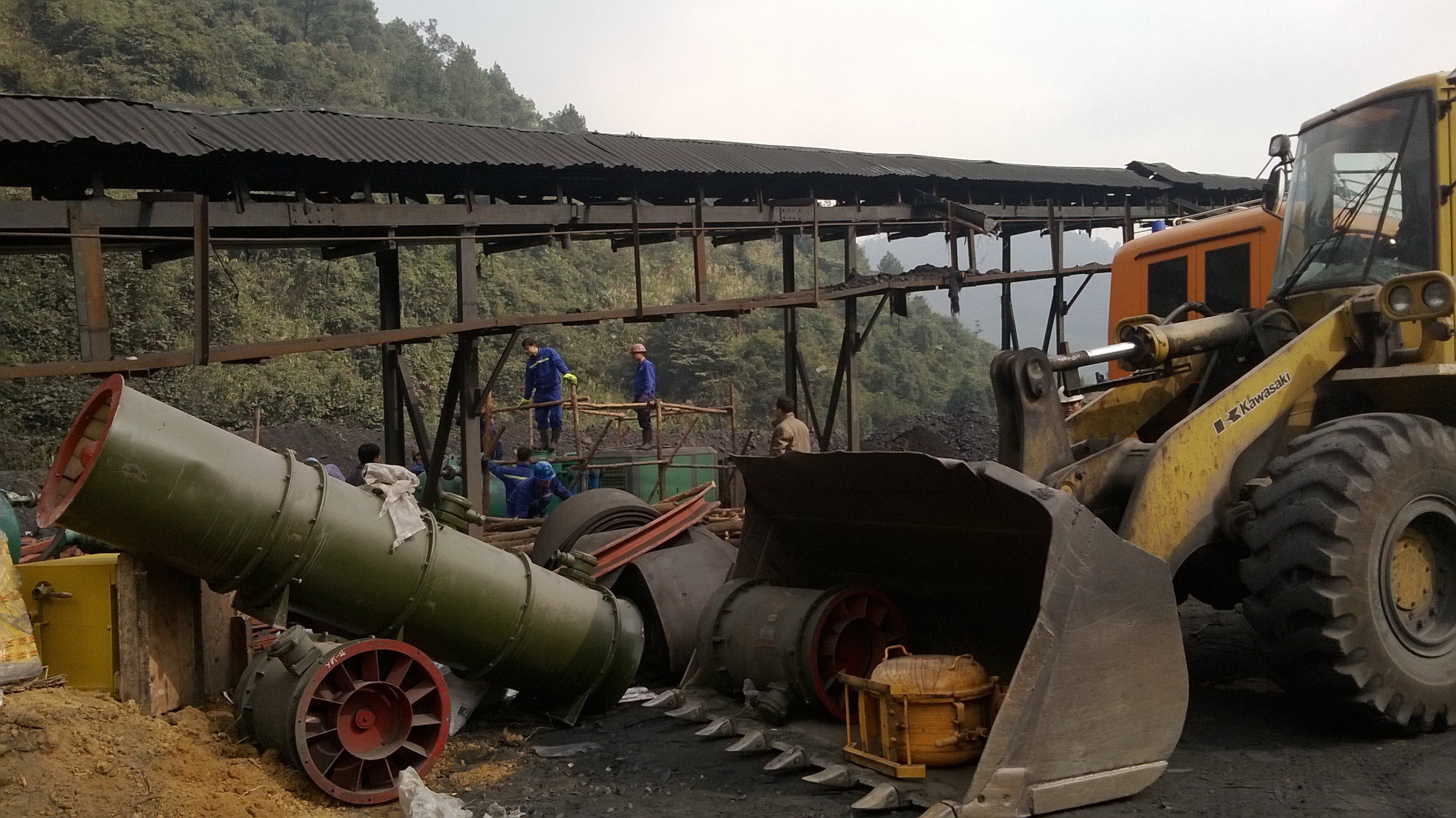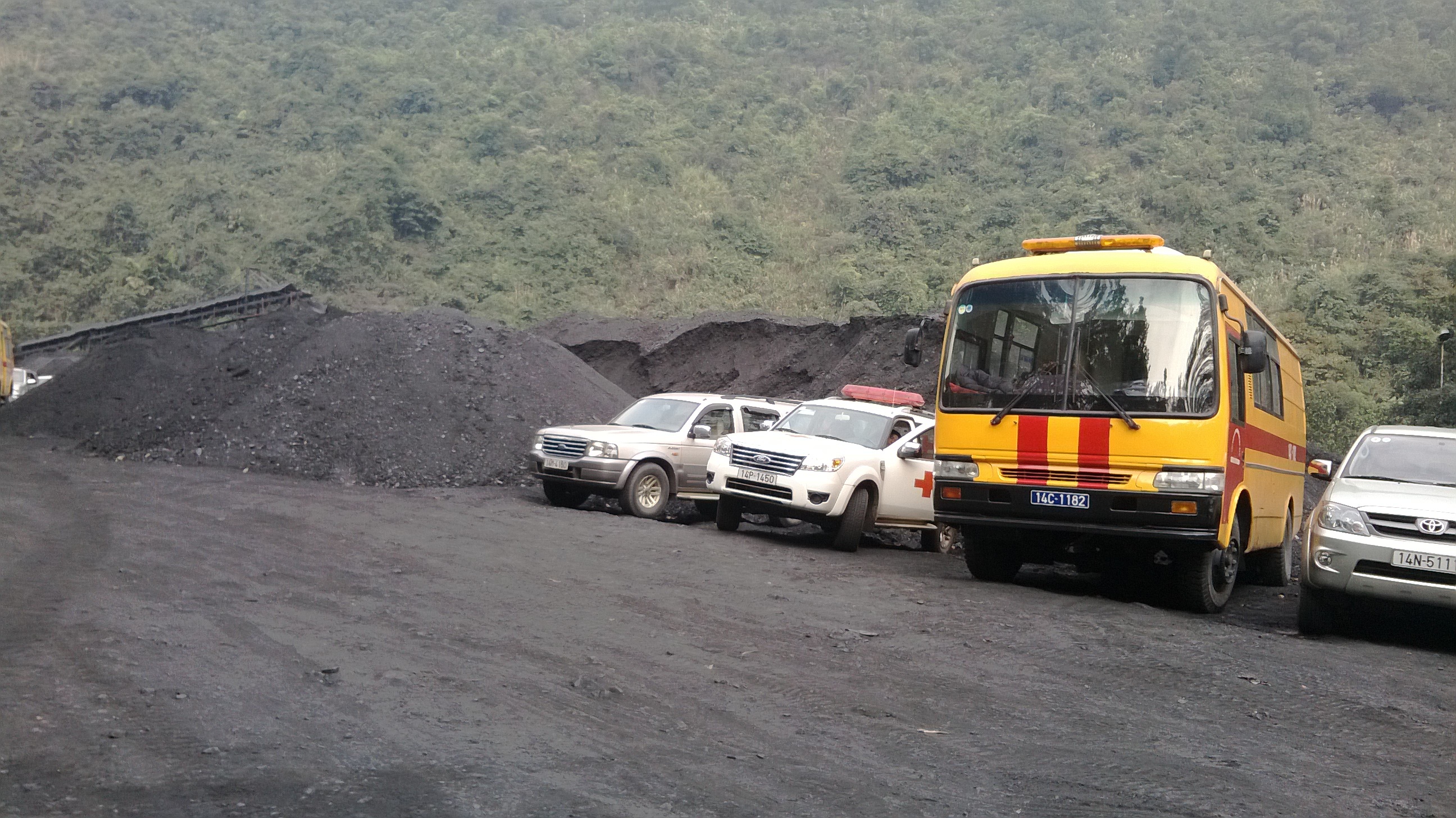 Khu vực lò than xảy ra cháy khiến 6 người thiệt mạng, xe cấp cứu được đưa tới hiện trường.
