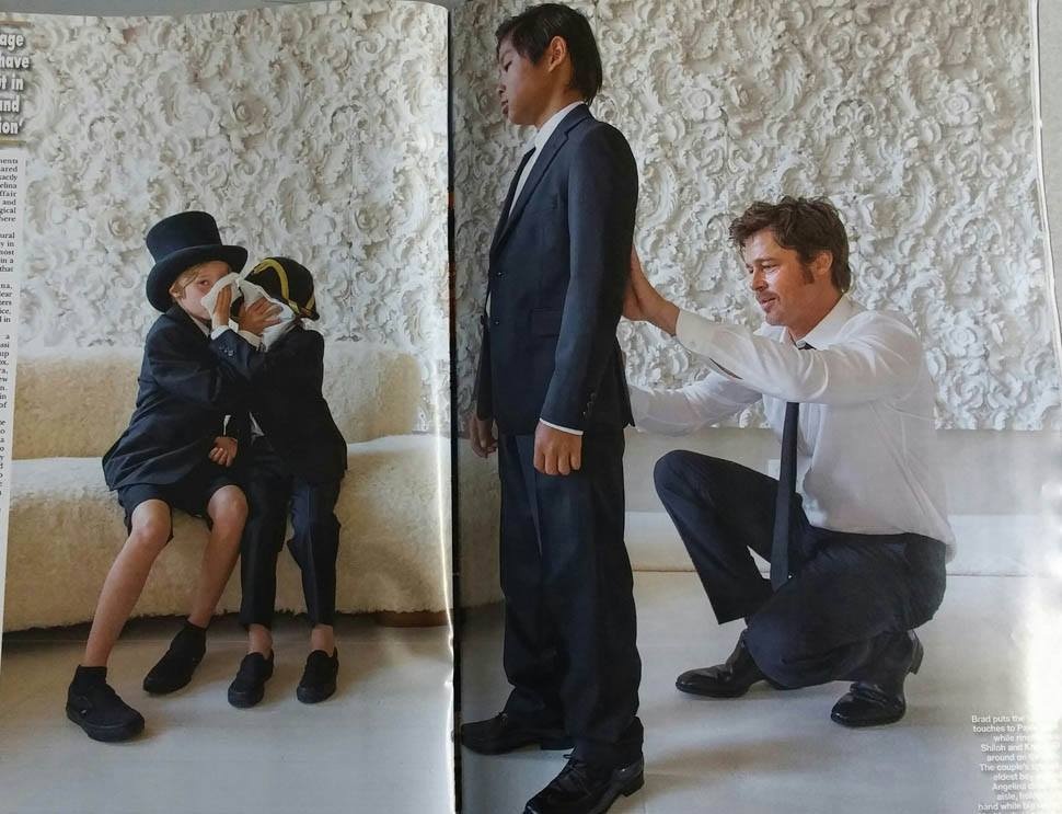 | Trong hôn lễ, chú rể Brad Pitt diện bộ vest cũ trong tủ quần áo, đi kèm với chiếc cà-vạt mượn từ con trai, vì anh quên đóng gói đồ đạc khi đến Pháp. Váy của Zahara do Adama Kebe, một người bạn của gia đình thiết kế. Maddox, Pax, Shiloh và Knox đóng bộ đen lịch sự. Váy của Vivienne cũng chỉ được tận dụng từ bộ sưu tập đồ hiệu có sẵn của cô bé. |