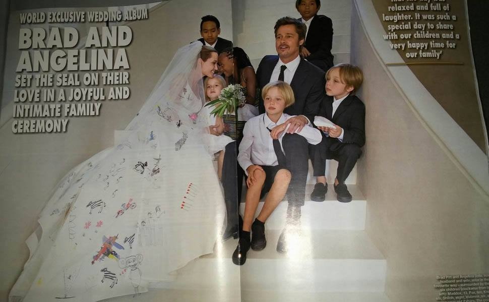 | Trước đó, những bức hình đầu tiên về đám cưới của cặp đôi đã xuất hiện trên tạp chí People và Hello. Angie trông đầy xúc động trong chiếc váy cưới màu trắng do Luigi Massi - nhà thiết kế chính của thương hiệu Atelier Versace - thực hiện. Điểm đặc biệt của chiếc váy là những tác phẩm hội họa của 6 nhóc tỳ nhà Jolie đã được đưa vào phần đuôi và khăn voan tạo nên những hoạ tiết độc nhất vô nhị. |