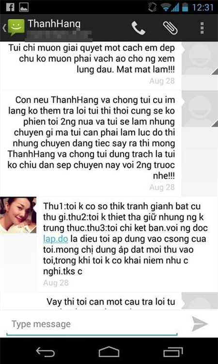 Sau đó, người phụ nữ nói trên cũng tỏ thái độ đe dọa khi vấp phải sự bình tĩnh từ đối phương: "Tôi chỉ muốn giải quyết một cách êm đẹp chứ không muốn vạch áo cho người xem lưng đâu. Mất mặt lắm. Còn nếu Thanh Hằng và chồng tôi cứ im lặng không thèm trả lời thì thôi cũng sẽ không phiền tới hai người nữa và tui sẽ làm những chuyện gì mà tui cần phải làm lúc đó thì những chuyện đáng tiếc xảy ra thì mong Thanh Hằng và chồng tui đừng trách là tui không chịu dàn xếp chuyện này với hai người trước".