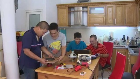 | Tác giả cùng với bạn bè đang trao đổi hoàn thiện một mẫu loa ván hở mới. |