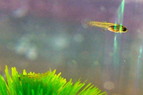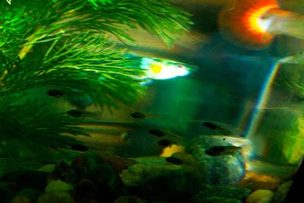 | Dài khoảng 5 mm, từ bụng mẹ, cá bảy màu sơ sinh "rơi tự do" xuống các lá rong hoặc nền bể |
