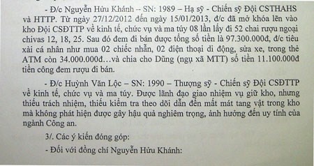 | Văn bản họp xử lý kỷ luật hạ sĩ Nguyễn Hữu Khánh. |
