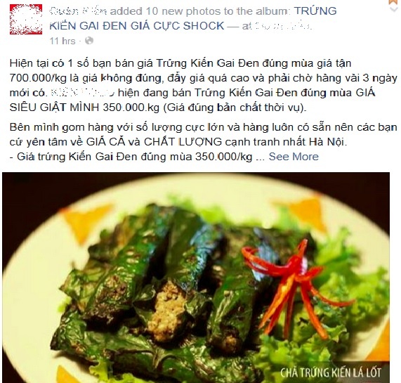 Dương rao bán trứng kiến gai đen xịn với giá 600.000 đồng/kg, tăng 100.000 đồng so với năm trước. Giá tăng, theo Dương, là do nhu cầu của thị trường Hà Nội ngày càng cao khiến hàng trở nên khan hiếm. Ngoài trứng tươi, shop này còn nhận bán rượu cốt trứng kiến với giá 150.000-300.000 đồng mỗi chai, tùy dung tích.