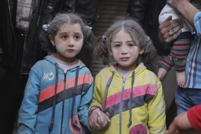 Bụi bám khắp người hai em nhỏ tại tỉnh Aleppo, Syria, sau một vụ tấn công bằng tên lửa do lực lượng trung thành với Tổng thống Bashar al-Assad thực hiện. Ảnh: Reuters
