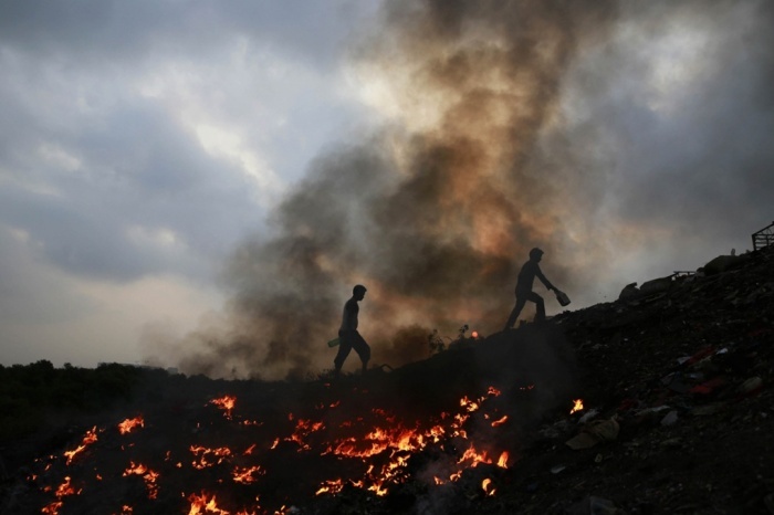 Những người nghèo tại khu ổ chuột Dharavi, thành phố Mumbai (Ấn Độ), di chuyển qua đống rác đang cháy rực. Theo thống kê của Tổ chức Y tế Thế giới, ô nhiễm không khí giết hơn 627.000 người dân Ấn Độ mỗi năm. Ấn Độ cũng là một trong 20 quốc gia ô nhiễm nhất hành tinh. Ảnh: AP