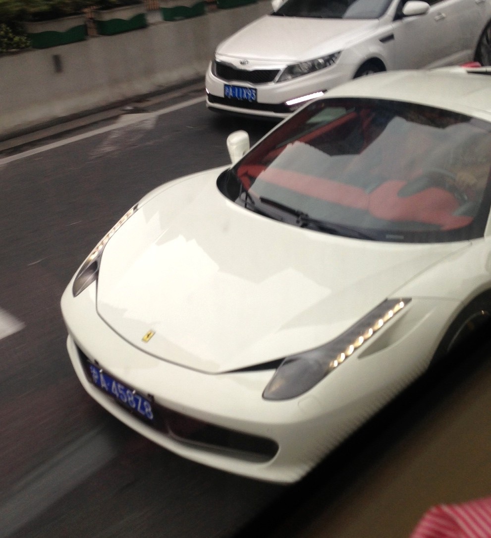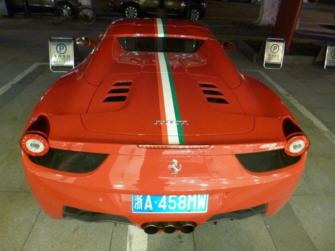 | Chiếc Ferrari 458 Spider hai màu biển số trùng tên 458 ở Hàng Châu, Trung Quốc. |
