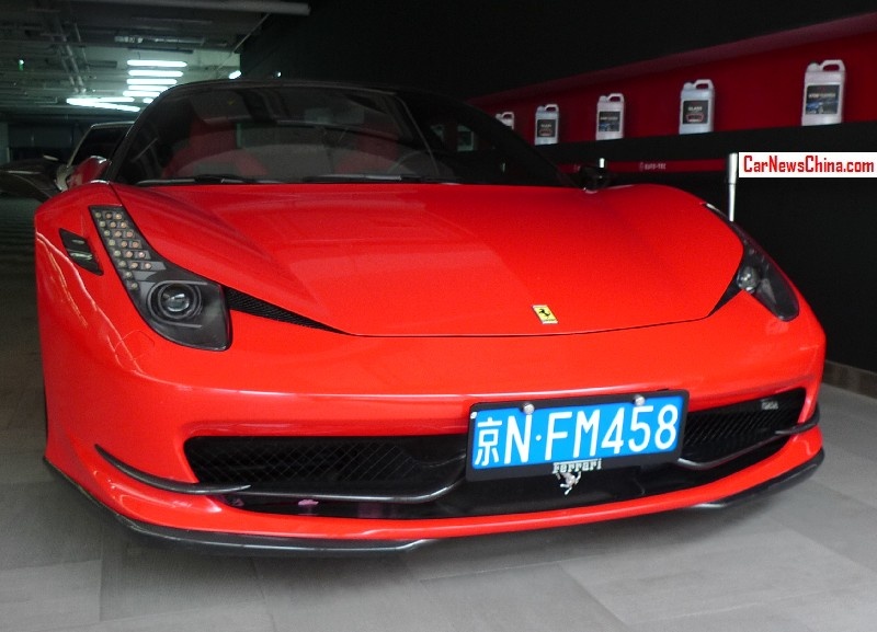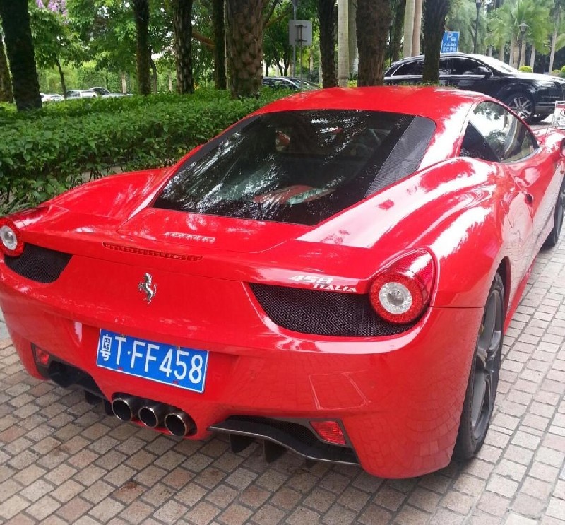 | Ferrari 458 Italia màu đỏ biển số FF458 ở tỉnh Quảng Đông, Trung Quốc. |