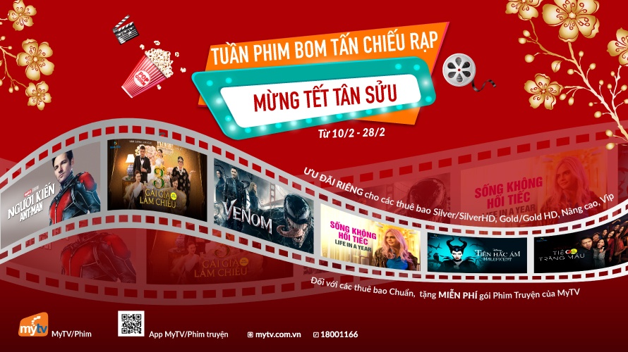 Khán giả đón xem "Tuần phim bom tấn chiếu rạp mừng Tết Tân Sửu" từ 10/2 đến 28/2 trên truyền hình MyTV (tại mục Phim) hoặc trên ứng dụng di động MyTV dành cho smartphone/tablet (tại mục Phim truyện). Ưu đãi này dành riêng cho các thuê bao Silver/SilverHD, Gold/Gold HD, Nâng cao, VIP của truyền hình MyTV. Riêng khách hàng gói Chuẩn được tặng miễn phí gói Phim truyện. Để đăng ký thuê bao mới, khán giả liên hệ 18001166, hoặc tải app MyTV trải nghiệm miễn phí gói Cơ bản tại đây.