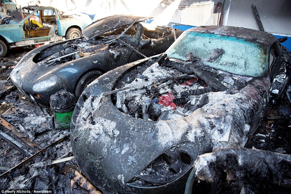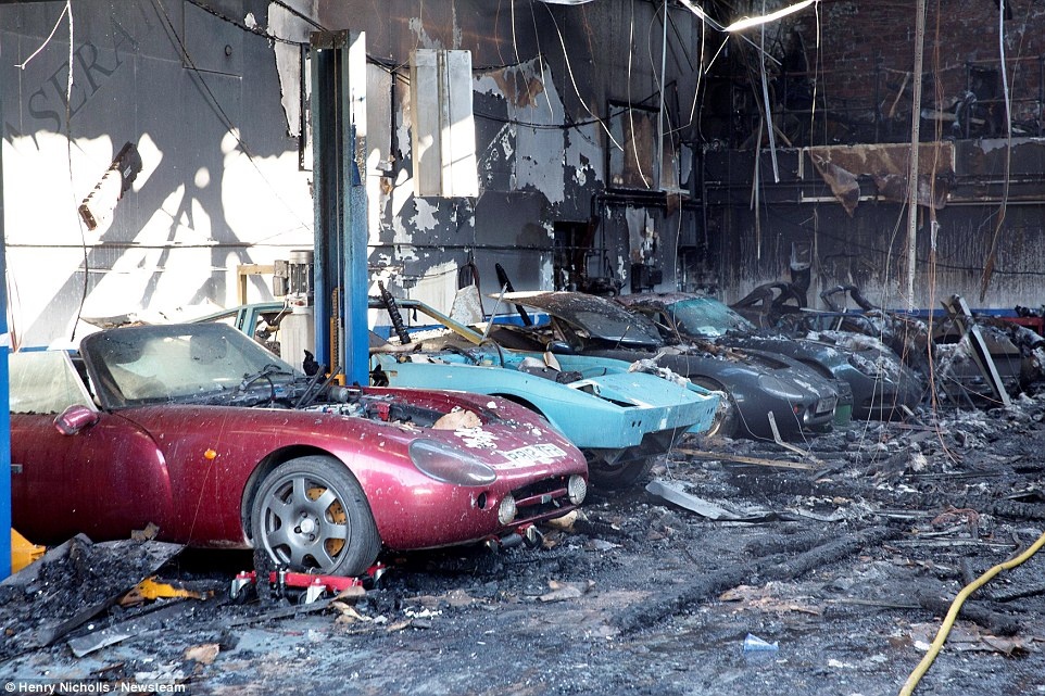 Phần còn lại của 3 siêu xe TVR, trị giá khoảng 100.000 USD sau đám cháy lớn tại trung tâm Central Sports Cars, thị trấn Stourbridge, hạt Tây Midlands, Anh. Theo Daily Mail, ngọn lửa bùng lên lúc 16h30 ngày 17/9.