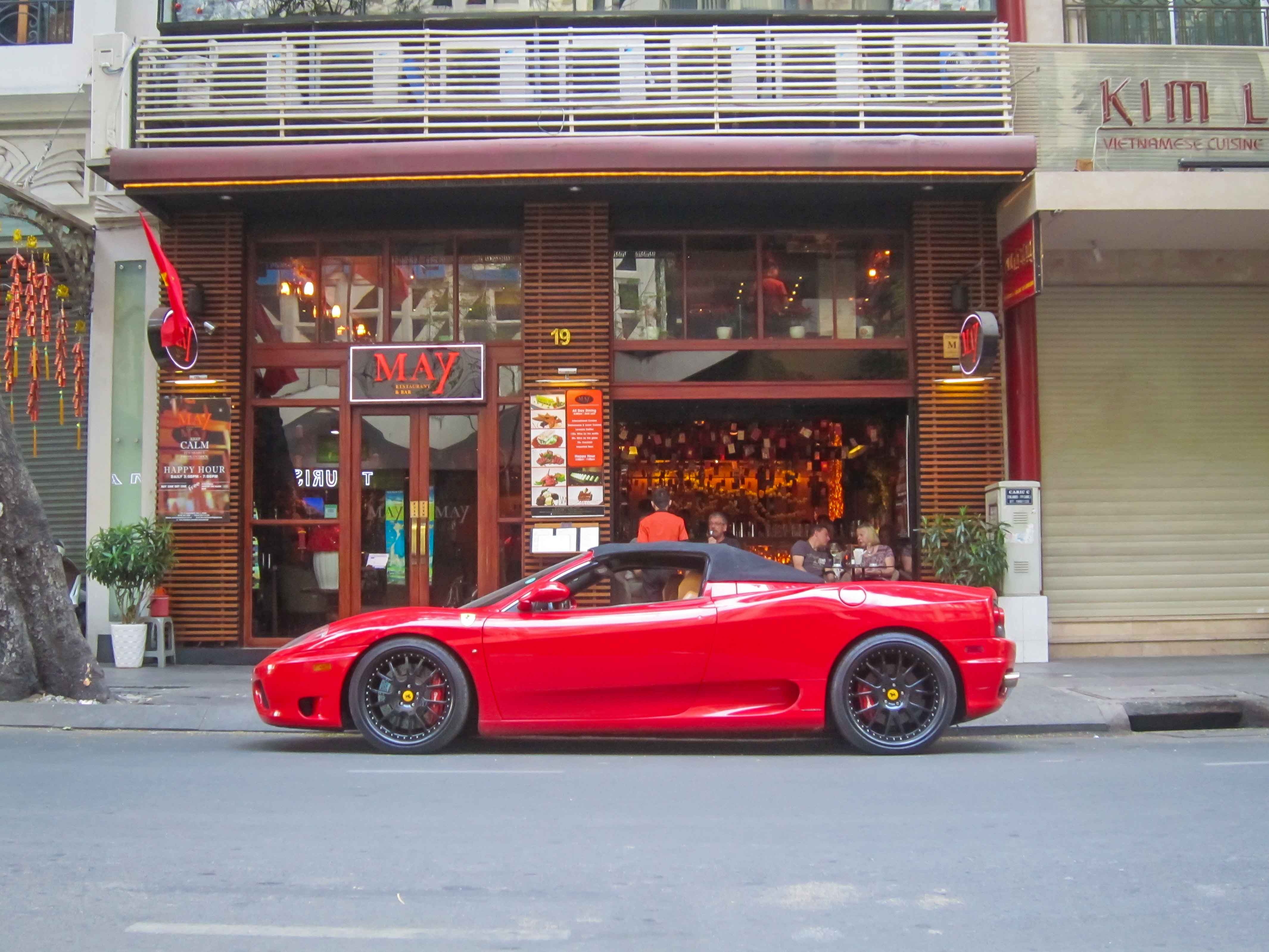Ferrari F360 Spider xuất hiện trên một tuyến phố Sài Gòn ngày đầu năm. Đây là dòng siêu xe sớm có mặt tại Việt Nam, và là biểu tượng tốc độ trong những năm đầu thế kỷ 21. Xe sử dụng động cơ V8, phun xăng trực tiếp, dung tích 3,6 lít, sản sinh 400 mã lực. Giá F360 mới tại Mỹ đời 2007 có giá khoảng 140.000 USD. |