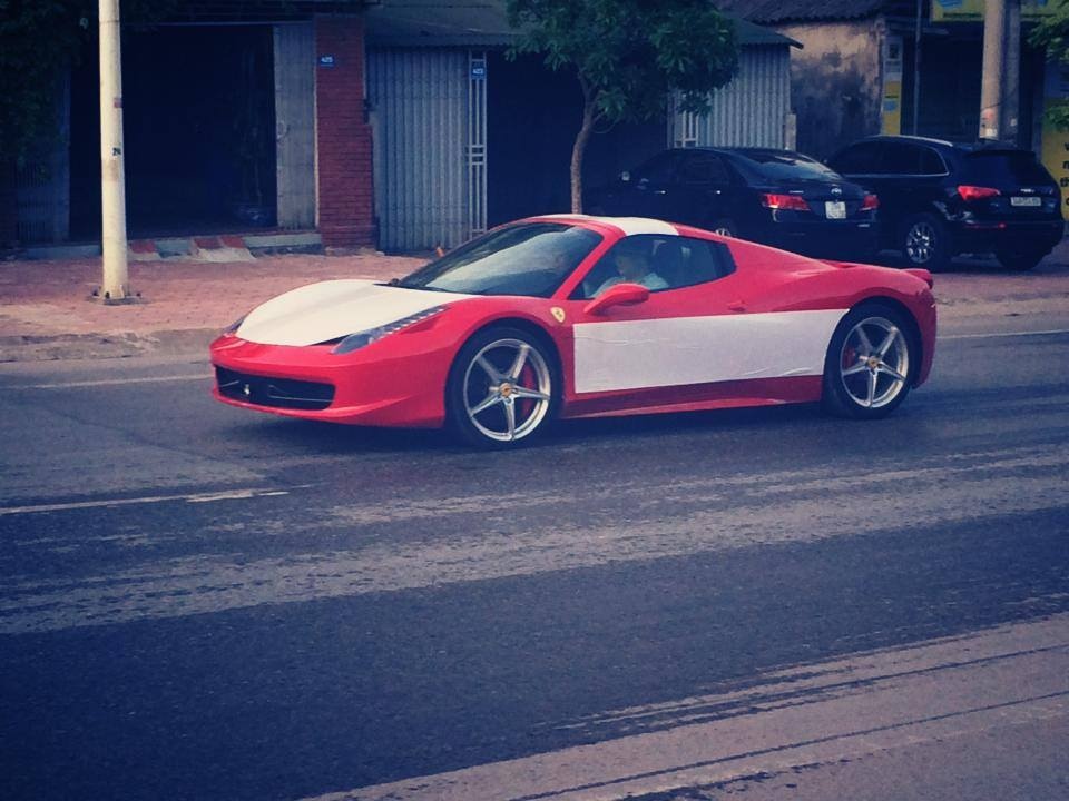 | Ferrari 458 Italia màu đỏ với lớp ngụy trang được bắt gặp trên quốc lộ 18A. Ở Việt Nam hiện có khoảng 6 chiếc, kể từ chiếc đầu tiên màu đen về nước năm 2010. |