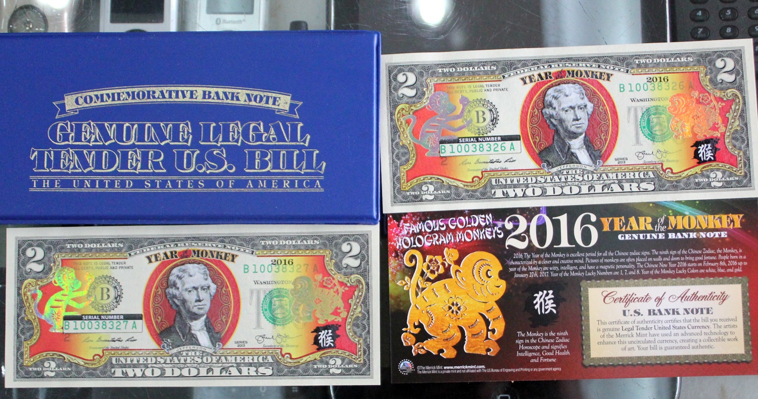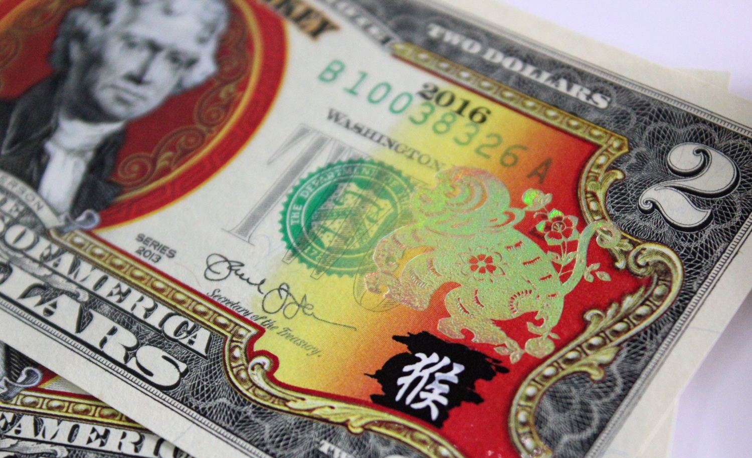| Tờ 2 USD vẫn được giữ nguyên bản chỉ in thêm hình khỉ vàng có nền màu đỏ. |