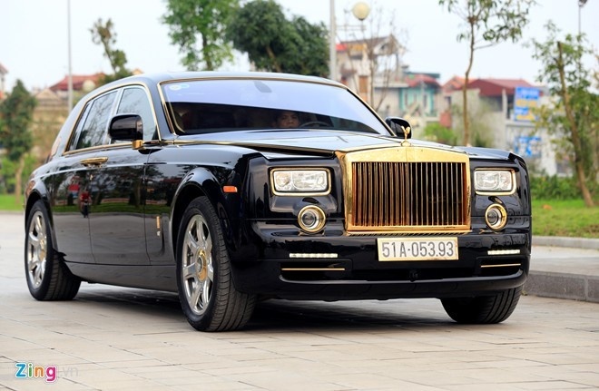 | Chiếc Rolls-Royce Phantom mang biển số Sài Gòn thuộc sở hữu của một đại gia kinh doanh bất động sản ở Hà Nội, được mạ vàng với độ tinh khiết 22k. Các chi tiết mạ vàng như mặt ca-lăng, miếng ốp cốp sau, nắp bình xăng, viền gương và một số điểm nhấn nội thất. |