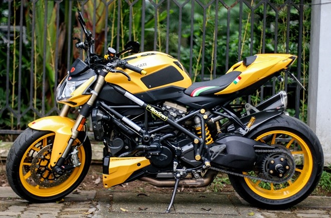 Mẫu Ducati 848 Streetfighter này được xem là chiếc duy nhất có màu vàng tại Việt Nam. Ngoài màu sơn độc đáo, chủ nhân của chiếc xe cũng trang bị thêm nhiều món đồ chơi hàng hiệu cho xe như cặp ống xả Termignoni, cặp gương Rizoma, trợ lực FG Gubellini, đèn xi nhan... và các chi tiết carbon khác. Ảnh: Thế Anh.