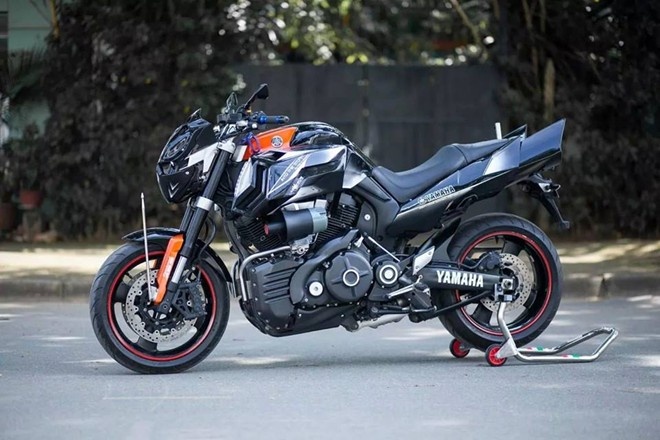Một biker tại Sài Gòn đã trang trí lại chiếc Yamaha MT-01 với phong cách độc đáo. Phần đầu xe được trang bị cụm đèn pha thiết kế lấy cảm hứng từ mặt quỷ, bình xăng được sơn airbrush, chế mủ. Trong khi đó, đuôi xe được gắn cặp ống xả lấy cảm hứng thiết kế từ mẫu Suzuki B-King. Ảnh: ABMiracle.