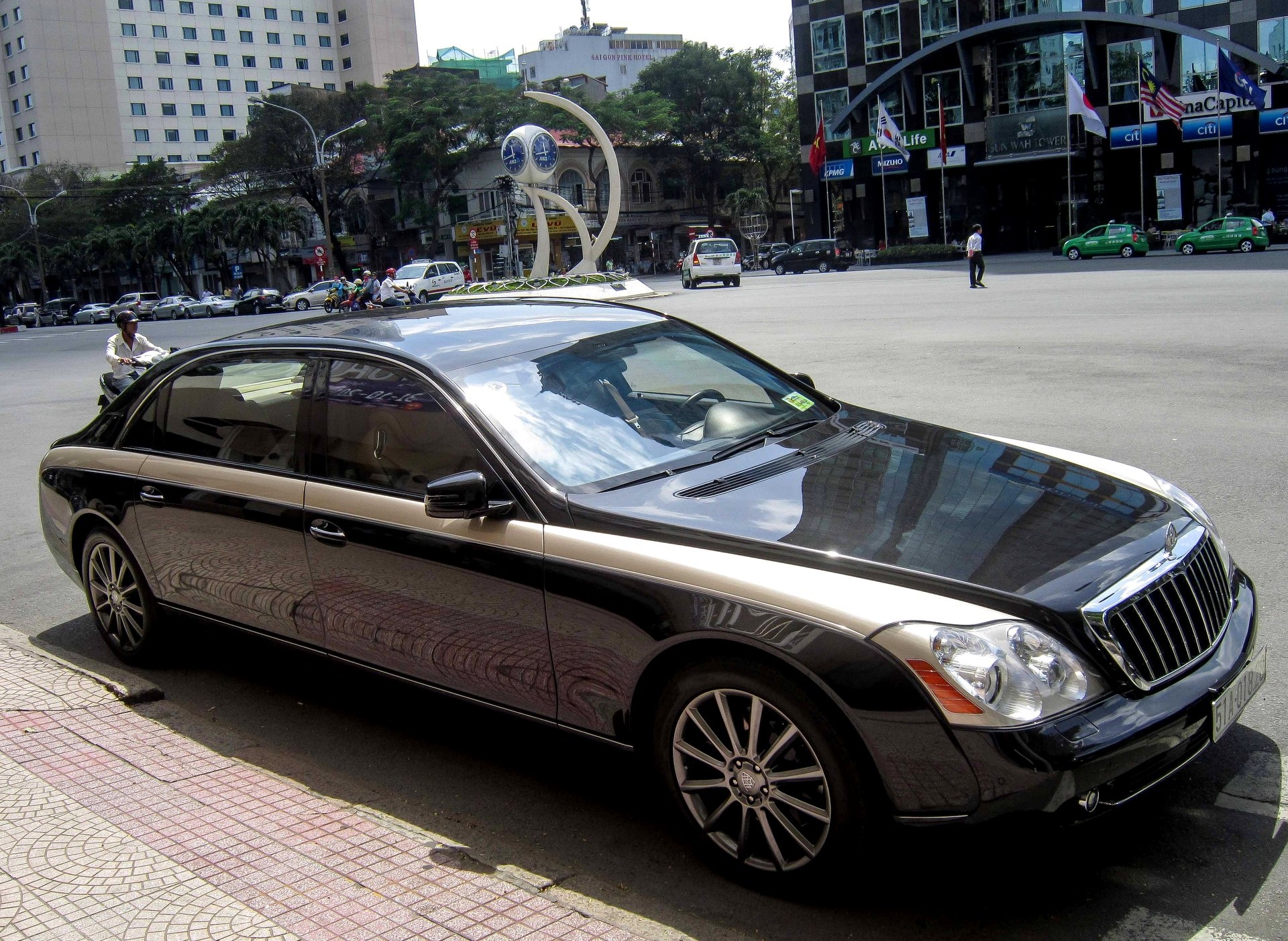 Maybach Zeppelin biển số trắng tại TP HCM. Đây từng được xem là chiếc xe đắt nhất tại Việt Nam. Điểm phân biệt giữa Maybach thường và Maybach Zeppelin là hai sọc sơn khác màu nổi bật chạy dọc thân xe.