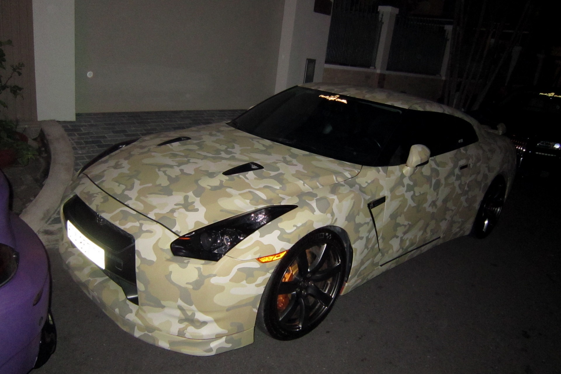 | Nissan GTR màu đỏ đã biến thành màu camo đậm chất nhà binh. Xe xuất hiện trong buổi offline của Saigon Team tối 23/9. |