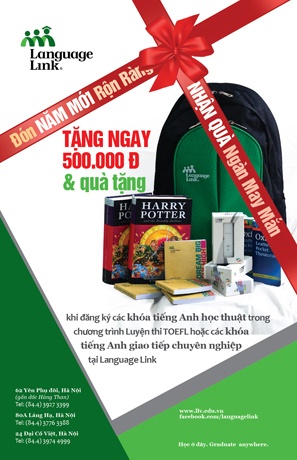 Có thể nói, “phi nước đại” trong năm ngựa cùng chương trình Luyện Thi TOEFL sẽ là cánh cửa đầu tiên đưa bạn đến gần tới thành công trong học tập sau này. Nhân dịp đầu Xuân, từ ngày 14/2 - 15/4, ngay khi đăng ký khóa học tiếng Anh học thuật trong chương trình Luyện thi TOEFL, bạn sẽ được lì xì 500,000 đồng cùng một trong các phần quà bốc thăm may mắn hấp dẫn: cuốn truyện tiếng Anh Harry Porter, Usb 3G, ba lô, từ điển, sổ tay…
