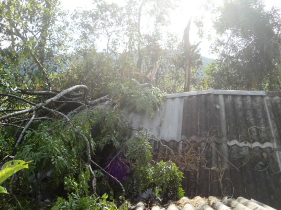 | Một cành cây bị gió quật gãy đập vào nhà dân gây hư hỏng nặng. |