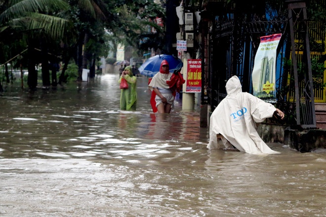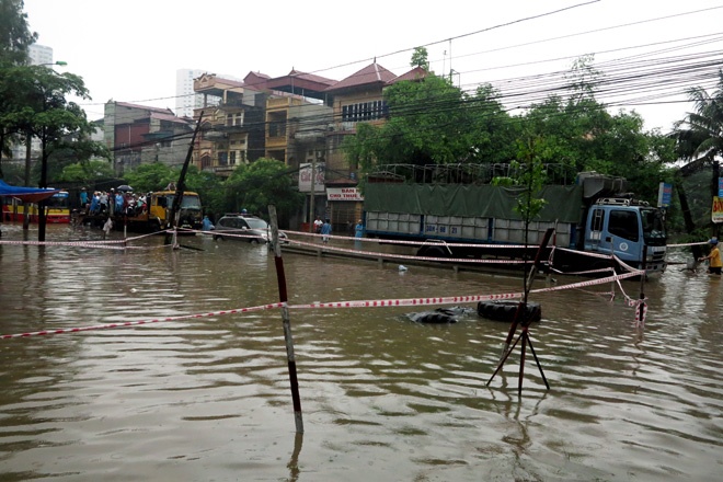 9h30 sáng, nơi sâu nhất đoạn đường 70 nước vẫn ngập gần hết bánh xe đạp. |