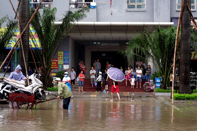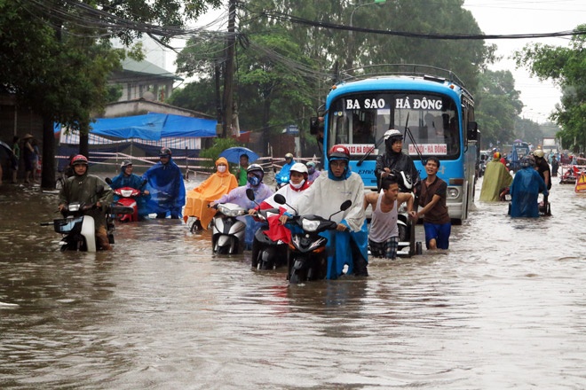 Chung cư CT5 Xa La, Hà Đông cách bệnh viện 103 chừng 200 mét cũng bị nước dâng vào tận cửa. Người đi làm xếp hàng chờ xe cải tiến vận chuyển xe máy qua đoạn ngập. |