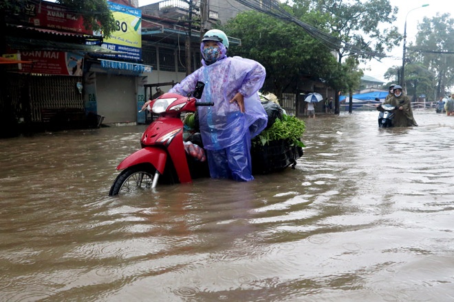 Đẩy xe qua đoạn ngập sâu dài 200 mét, chị hàng rau |