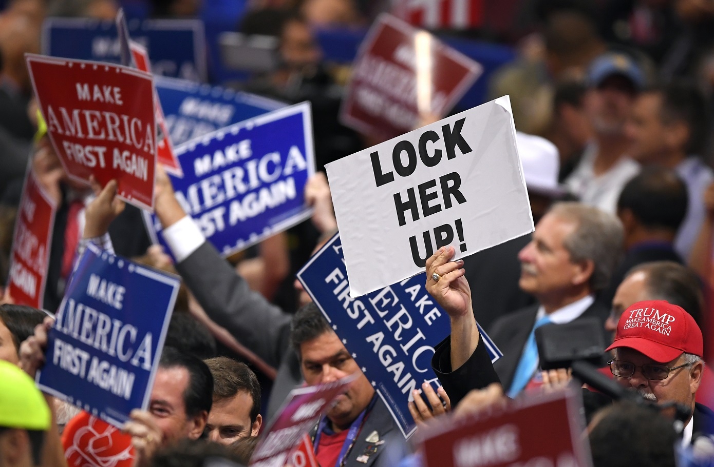 Thay vì hưởng ứng lời kêu gọi của Trump hoặc hô vang tuyên ngôn tranh cử của tỷ phú, đám đông ủng hộ ông thể hiện rõ sự phẫn nộ đối với bà Clinton qua việc đồng thanh đòi bỏ tù nữ ứng viên. "Lock her up" (tạm dịch: Hãy tống giam bà ta) gần như trở thành một khẩu hiệu mới của những người ủng hộ ứng viên của đảng Cộng hòa. Câu này vang lên tại tất cả những buổi vận động tranh cử của vị tỷ phú suốt thời gian qua.