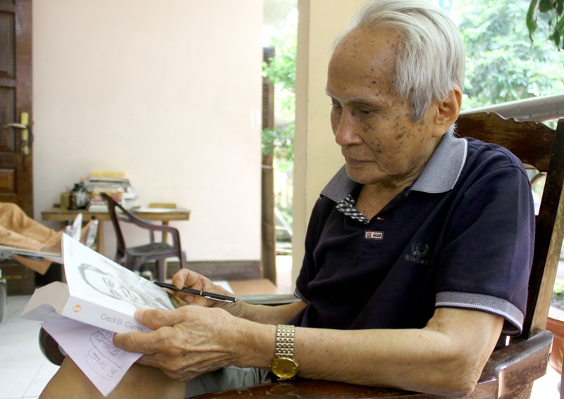 | Trung tướng Nguyễn Quốc Thước bên tác phẩm viết về Đại tướng. |