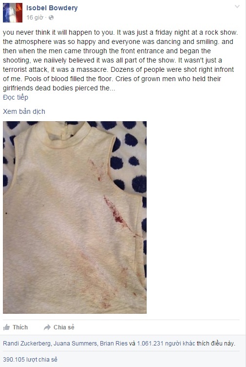 | Bài đăng về ký ức sống sót sau đêm thảm sát ở nhà hát tại Paris của cô Isobel Bowdery nhận được sự quan tâm và chia sẻ lớn từ người dùng Facebook. |