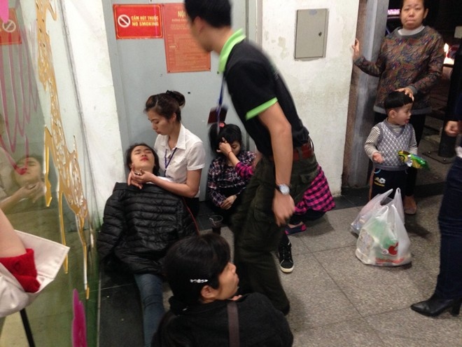 Gần 30 người được dìu ra sảnh tầng 1, được xoa dầu gió khắp người. Lúc này, đang đứng sơ cứu cho đồng nghiệp, 2 nữ nhân viên bất ngờ quỵ gối, thở dốc, nhắm nghiền mắt và liên tục nôn khan. Những nhân viên còn lại đưa 2 người lên ghế, sơ cứu.