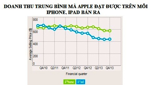 Apple đã đạt được kỷ lục mới về doanh số iPhone trong quý IV, có thể vì sự trình làng cùng lúc của cả iPhone 5S và iPhone 5C. Cụ thể, Apple bán được 33,8 triệu chiếc iPhone trong quý IV/2013, so với 26,9 triệu máy trong quý IV/2012. Doanh số iPad về cơ bản vẫn ổn định ở mức 14,1 triệu. Tuy nhiên, lý do khiến lợi nhuận giảm có thể là giá bán trung bình của iPad giảm, và giá bán trung bình của iPhone đang ở mức thấp nhất mọi thời đại. Doanh thu của Apple trên mỗi sản phẩm bán ra đang tiếp tục giảm.