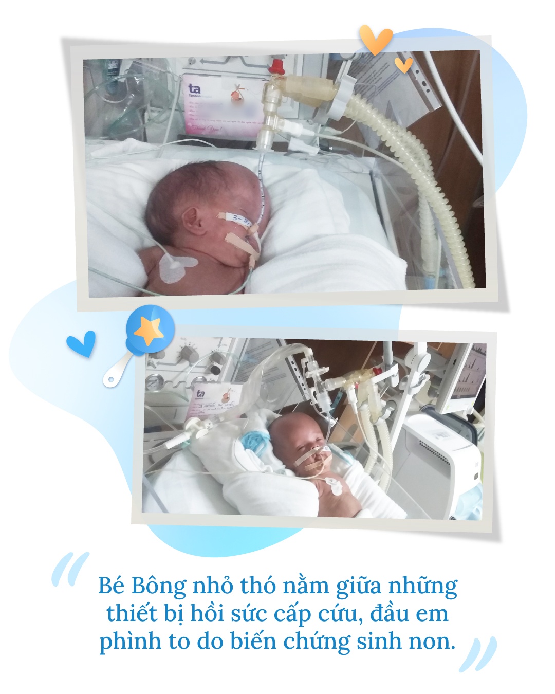 Bông chào đời khi được 27 tuần, trước dự sinh hơn 3 tháng, nặng 1,3 kg. Em nằm tại một bệnh viện phụ sản từ lúc mới sinh nhưng sức khỏe rất yếu, diễn biến ngày càng nặng, đầu to dần và ứ nước. Trong suốt 2 tháng, các y bác sĩ tại bệnh viện địa phương đã thử nhiều giải pháp để cai máy thở cho bé nhưng thất bại. Em bị viêm phổi nặng, nhiều ổ nhiễm trùng, tiên lượng rất xấu.